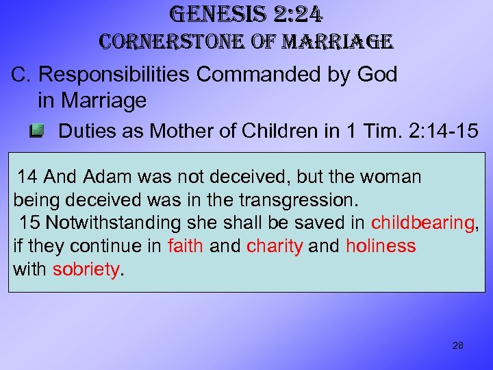 GENESIS 2: 24 CORNERSTONE OF MARRIAGE C. Responsibilities Commanded by God in Marriage Duties as Mother of Children in 1 Tim. 2: 14 -15 14 And Adam was not deceived, but the woman being deceived was in the transgression. 15 Notwithstanding she shall be saved in childbearing, if they continue in faith and charity and holiness with sobriety. 28