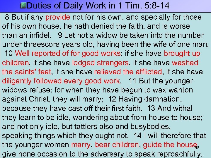 Duties of Daily Work in 1 Tim. 5: 8 -14 8 But if any provide not for his own, and specially for those of his own house, he hath denied the faith, and is worse than an infidel. 9 Let not a widow be taken into the number under threescore years old, having been the wife of one man, 10 Well reported of for good works; if she have brought up children, if she have lodged strangers, if she have washed the saints' feet, if she have relieved the afflicted, if she have diligently followed every good work. 11 But the younger widows refuse: for when they have begun to wax wanton against Christ, they will marry; 12 Having damnation, because they have cast off their first faith. 13 And withal they learn to be idle, wandering about from house to house; and not only idle, but tattlers also and busybodies, speaking things which they ought not. 14 I will therefore that the younger women marry, bear children, guide the house, 29 give none occasion to the adversary to speak reproachfully.