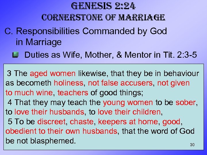 GENESIS 2: 24 CORNERSTONE OF MARRIAGE C. Responsibilities Commanded by God in Marriage Duties as Wife, Mother, & Mentor in Tit. 2: 3 -5 3 The aged women likewise, that they be in behaviour as becometh holiness, not false accusers, not given to much wine, teachers of good things; 4 That they may teach the young women to be sober, to love their husbands, to love their children, 5 To be discreet, chaste, keepers at home, good, obedient to their own husbands, that the word of God be not blasphemed. 30
