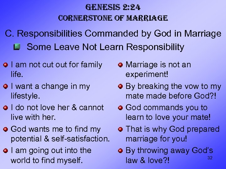 GENESIS 2: 24 CORNERSTONE OF MARRIAGE C. Responsibilities Commanded by God in Marriage Some Leave Not Learn Responsibility I am not cut out for family life. I want a change in my lifestyle. I do not love her & cannot live with her. God wants me to find my potential & self-satisfaction. I am going out into the world to find myself. Marriage is not an experiment! By breaking the vow to my mate made before God? ! God commands you to learn to love your mate! That is why God prepared marriage for you! By throwing away God’s 32 law & love? !