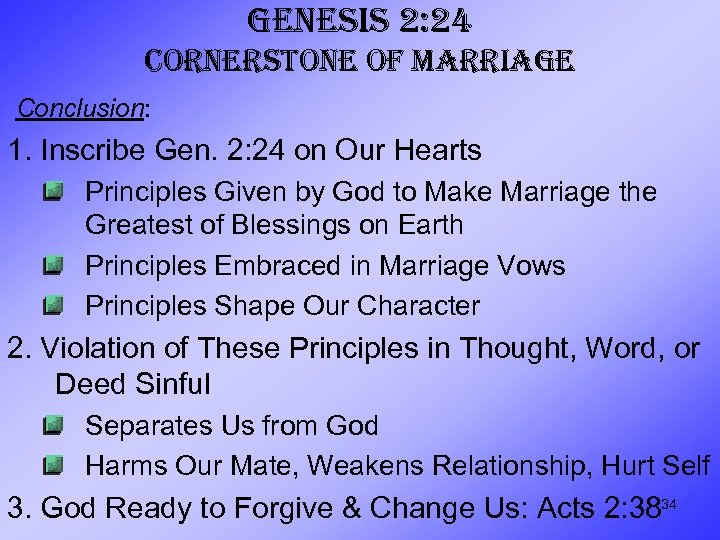 GENESIS 2: 24 CORNERSTONE OF MARRIAGE Conclusion: 1. Inscribe Gen. 2: 24 on Our Hearts Principles Given by God to Make Marriage the Greatest of Blessings on Earth Principles Embraced in Marriage Vows Principles Shape Our Character 2. Violation of These Principles in Thought, Word, or Deed Sinful Separates Us from God Harms Our Mate, Weakens Relationship, Hurt Self 3. God Ready to Forgive & Change Us: Acts 2: 3834