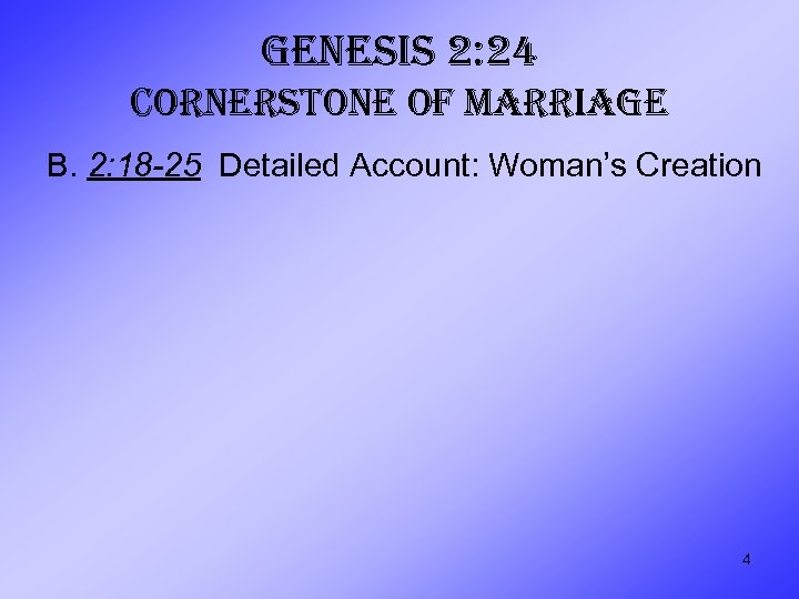 GENESIS 2: 24 CORNERSTONE OF MARRIAGE B. 2: 18 -25 Detailed Account: Woman’s Creation 4