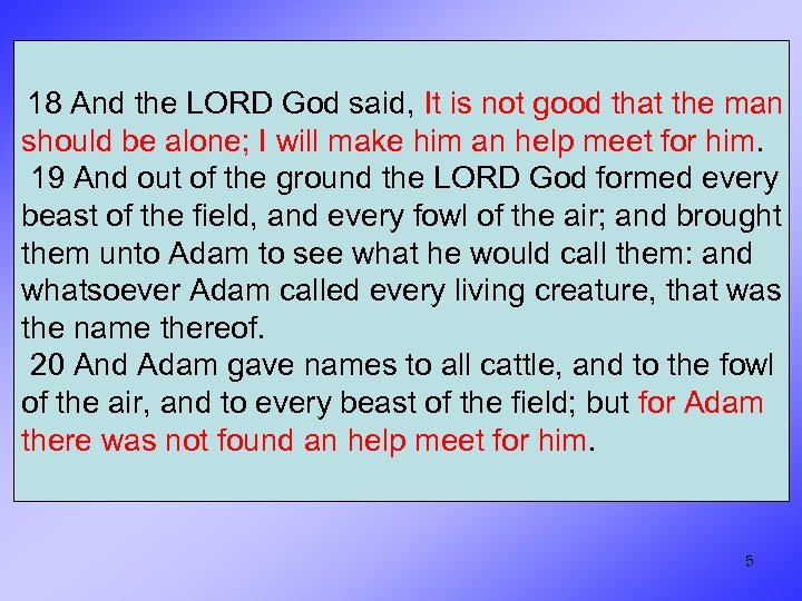 18 And the LORD God said, It is not good that the man should be alone; I will make him an help meet for him. 19 And out of the ground the LORD God formed every beast of the field, and every fowl of the air; and brought them unto Adam to see what he would call them: and whatsoever Adam called every living creature, that was the name thereof. 20 And Adam gave names to all cattle, and to the fowl of the air, and to every beast of the field; but for Adam there was not found an help meet for him. 5