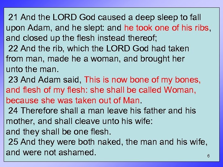 21 And the LORD God caused a deep sleep to fall upon Adam, and he slept: and he took one of his ribs, and closed up the flesh instead thereof; 22 And the rib, which the LORD God had taken from man, made he a woman, and brought her unto the man. 23 And Adam said, This is now bone of my bones, and flesh of my flesh: she shall be called Woman, because she was taken out of Man. 24 Therefore shall a man leave his father and his mother, and shall cleave unto his wife: and they shall be one flesh. 25 And they were both naked, the man and his wife, and were not ashamed. 6