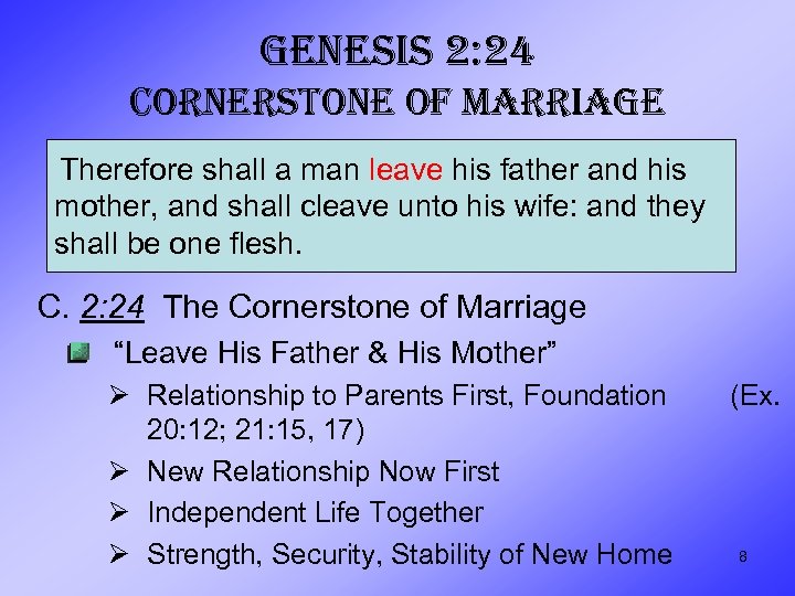 GENESIS 2: 24 CORNERSTONE OF MARRIAGE B. 2: 18 -25 Detailed Account: Woman’s Creation Vs. 18 Man Without Suitable Helper Vv. 19 -20 Adam Reviews & Names Animals Vv. 21 -23 Eve Made From Adam’s Rib Ø Ø Ø Ø Joyful, Thankful Excitement! From His Side, Not Head or Heel Near & Dear, Union & Unity Value, Protect as Part of Himself Companionship, Communication, Complement Share Blessings, Duties, Dominion Total, Comprehensive Love 7