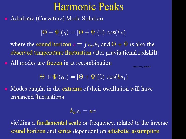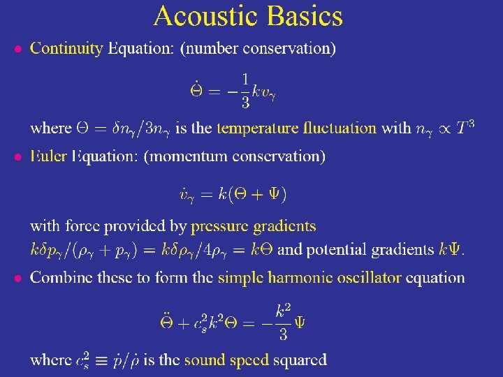Universe at z>1100 is hot, matter dominated, but still full of photons. Basic paradigm assumes fluctuations are from inflation…quantum fluctuations at t=10 -35 s are expanded by ~e 60 times. The quantum fluctuations become the matter fluctuations across the entire universe… On smaller scales, gravitational matter collapses in overdensities, but when this happens, pressure and temperature increase. Size scale is set by the speed of sound. At any given time…speed of sound * age of Universe creates a sound-horizon, coherent scales where matter is falling in for the first time, on smaller scales, matter has reverberated in and out…