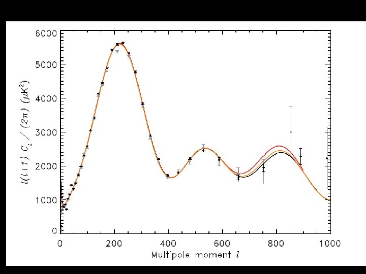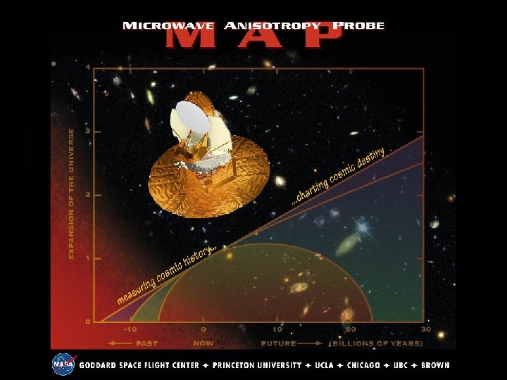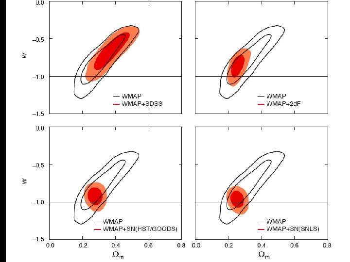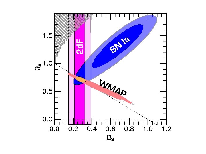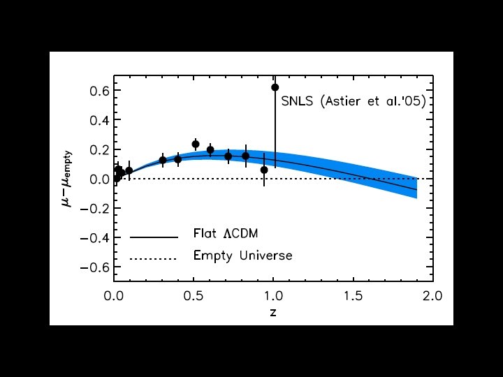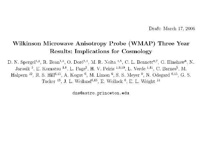 The Cosmic Timeline • CMB last scattering surface: (WMAP) tdec = 379 ± 8 kyr (zdec = 1089 ± 1) • Epoch of re-ionization? : WMAP and QSOs seem to disagree a bit – tr = 300 - 1000 Myr • Age of the universe today: SN +WMAP agree very well t 0 = 13. 7 ± 0. 2 Gyr • Hubble constant: (CMB+2 d. F, or Cepheids + SN Ia) H 0 = 71 ± 4 km/s/Mpc