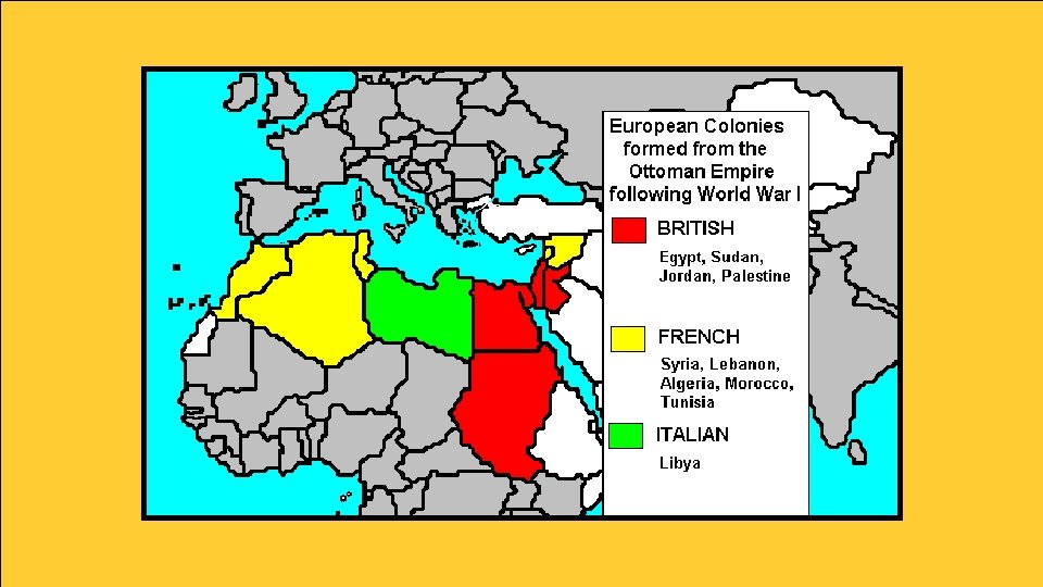 Ottoman Empire • Over time, the Ottoman sultans were not very capable of ruling and the empire began to decline. • During World War I, the Ottoman Empire sided with the Central Powers. Bad idea… • After the war, the government collapsed and the land of the former Ottoman Empire was divided among the victorious European countries: • France: Syria, Lebanon, Algeria, Morocco, Tunisia • Great Britain: Egypt, Sudan, Jordan, Palestine • Italy: Libya