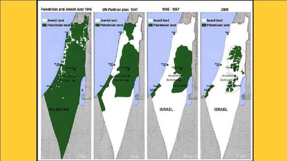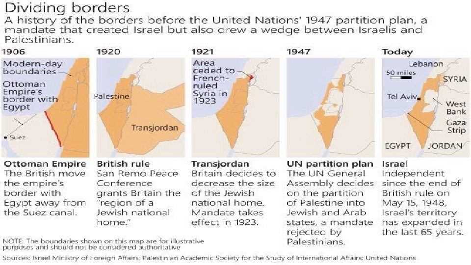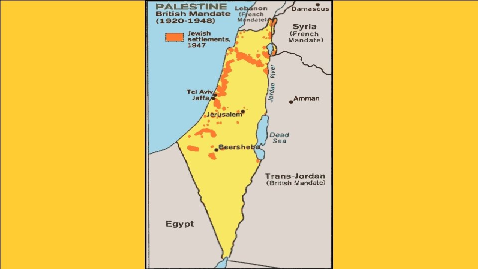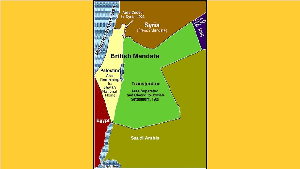 Palestine • Great Britain officially took control of Palestine as a mandate (similar to a colony). • Arabs felt betrayed that they were not given the area like they were promised, especially since they made up the largest part of the population. • Under British occupation, the number of Jewish settlers increased greatly. • In 1920, there was 1 Jew to every 10 Arabs. By 1947, there was 1 Jew for every 2 Arabs. • The Arabs felt that they were loosing control of their land. • As Jewish immigration continued, tension between Arabs and Jews increased.