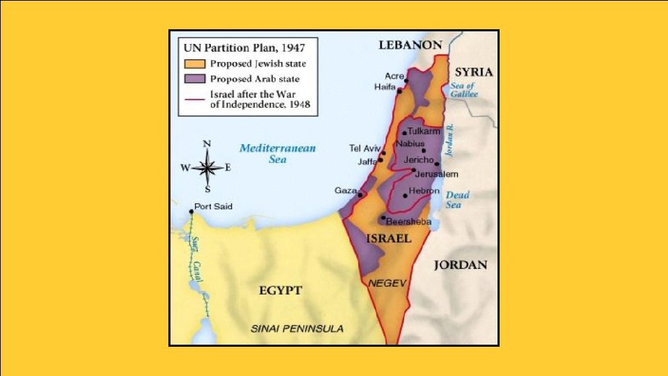The Partition • In 1947, Great Britain asks the United Nations for help in dividing up the land that was promised to both the Jews and the Arabs. • The United Nations felt it was right to create a Jewish state in Palestine due to their suffering in the Holocaust. • Jews agreed, but Arabs vowed to do anything needed to prevent the U. N. plan from being carried out. • The Jews were outnumbered in Palestine, but their armies were much more advanced because of involvement in World War II. • Despite the bloodshed, the State of Israel was created on May 14, 1948. • That night, a combined Arab force of Egyptians, Iraqis, Jordanians, Syrians, Lebanese, Saudi, and Yemeni troops attacked…