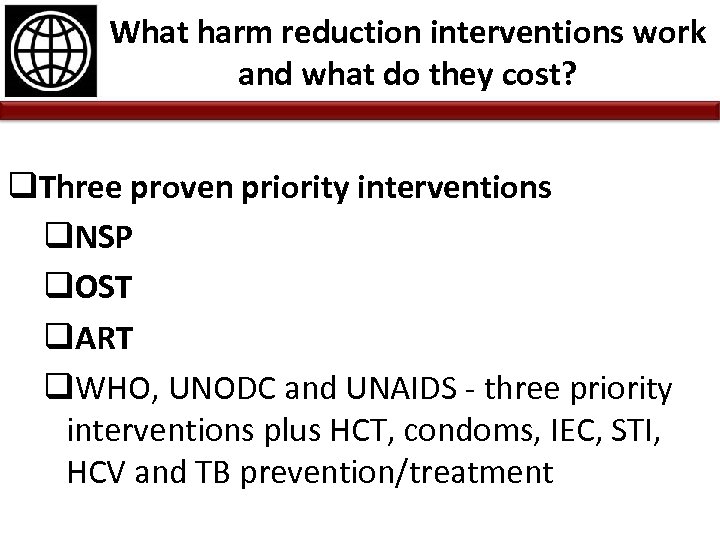 What harm reduction interventions work and what do they cost? q. Three proven priority interventions q. NSP q. OST q. ART q. WHO, UNODC and UNAIDS - three priority interventions plus HCT, condoms, IEC, STI, HCV and TB prevention/treatment