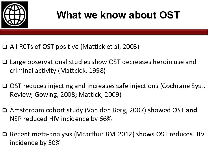 What we know about OST q All RCTs of OST positive (Mattick et al, 2003) q Large observational studies show OST decreases heroin use and criminal activity (Mattcick, 1998) q OST reduces injecting and increases safe injections (Cochrane Syst. Review; Gowing, 2008; Mattick, 2009) q Amsterdam cohort study (Van den Berg, 2007) showed OST and NSP reduced HIV incidence by 66% q Recent meta-analysis (Mcarthur BMJ 2012) shows OST reduces HIV incidence by 50%