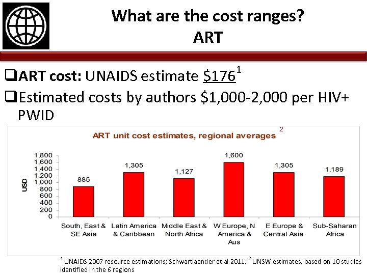 What are the cost ranges? ART 1 q. ART cost: UNAIDS estimate $176 q. Estimated costs by authors $1, 000 -2, 000 per HIV+ PWID 2 1 UNAIDS 2007 resource estimations; Schwartlaender et al 2011. 2 UNSW estimates, based on 10 studies identified in the 6 regions