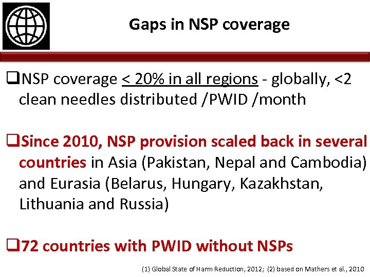 Gaps in NSP coverage q. NSP coverage < 20% in all regions - globally, <2 clean needles distributed /PWID /month q. Since 2010, NSP provision scaled back in several countries in Asia (Pakistan, Nepal and Cambodia) and Eurasia (Belarus, Hungary, Kazakhstan, Lithuania and Russia) q 72 countries with PWID without NSPs (1) Global State of Harm Reduction, 2012; (2) based on Mathers et al. , 2010