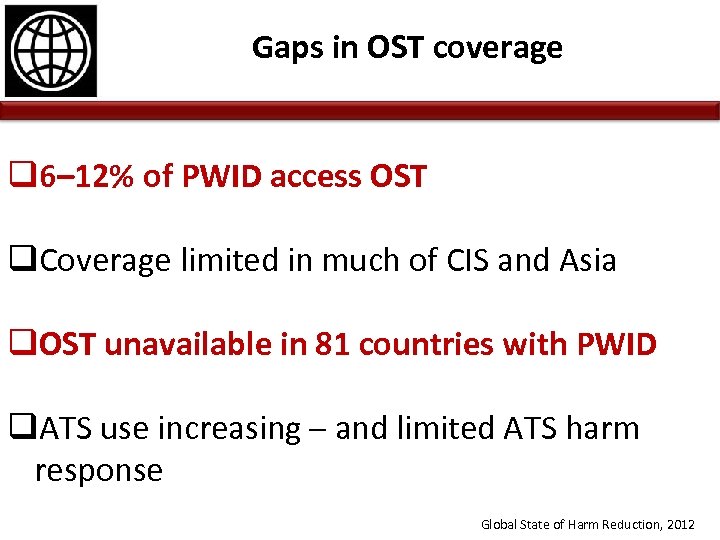 Gaps in OST coverage q 6– 12% of PWID access OST q. Coverage limited in much of CIS and Asia q. OST unavailable in 81 countries with PWID q. ATS use increasing – and limited ATS harm response Global State of Harm Reduction, 2012
