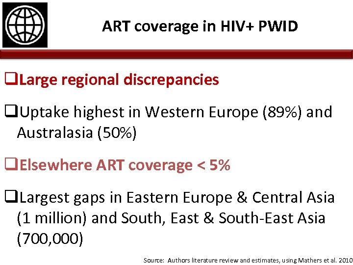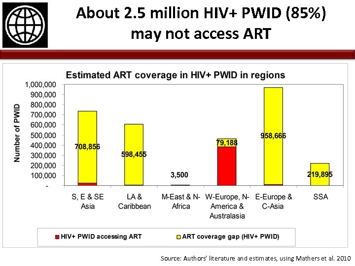 About 2. 5 million HIV+ PWID (85%) may not access ART Source: Authors’ literature and estimates, using Mathers et al. 2010