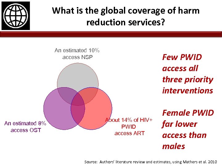 What is the global coverage of harm reduction services? An estimated 10% access NSP An estimated 8% access OST Few PWID access all three priority interventions About 14% of HIV+ PWID access ART Female PWID far lower access than males Source: Authors’ literature review and estimates, using Mathers et al. 2010