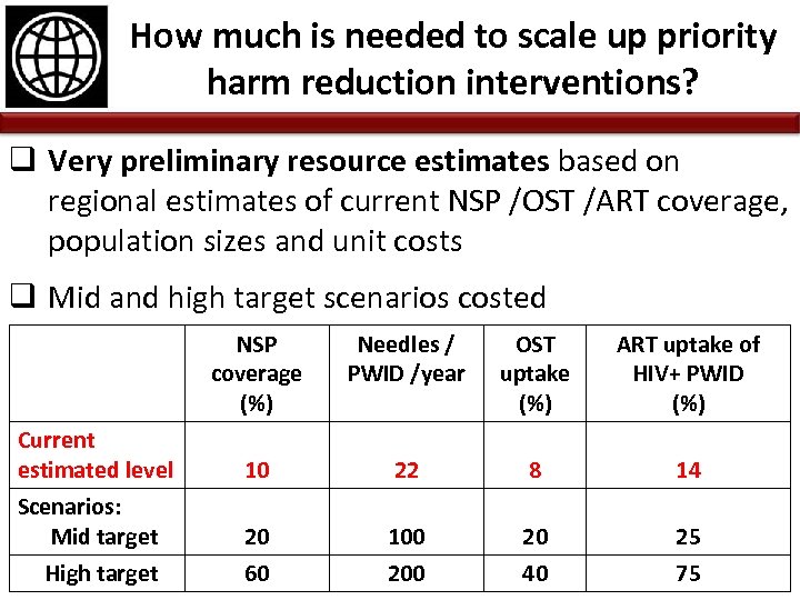 How much is needed to scale up priority harm reduction interventions? q Very preliminary resource estimates based on regional estimates of current NSP /OST /ART coverage, population sizes and unit costs q Mid and high target scenarios costed NSP coverage (%) Needles / PWID /year OST uptake (%) ART uptake of HIV+ PWID (%) Current estimated level 10 22 8 14 Scenarios: Mid target 20 100 20 25 High target 60 200 40 75