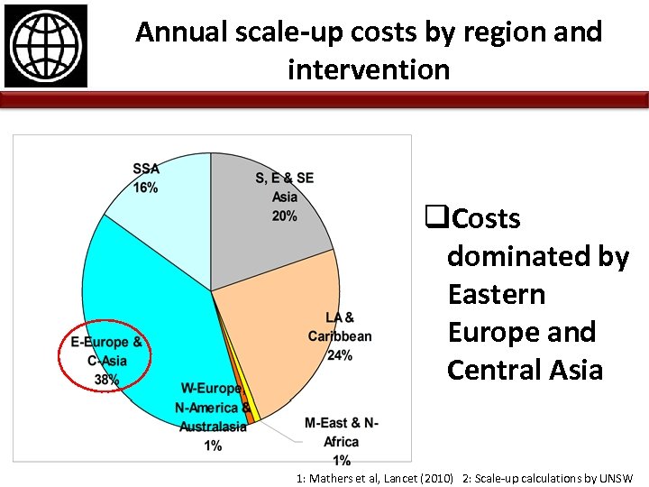 Annual scale-up costs by region and intervention q. Costs dominated by Eastern Europe and Central Asia 1: Mathers et al, Lancet (2010) 2: Scale-up calculations by UNSW