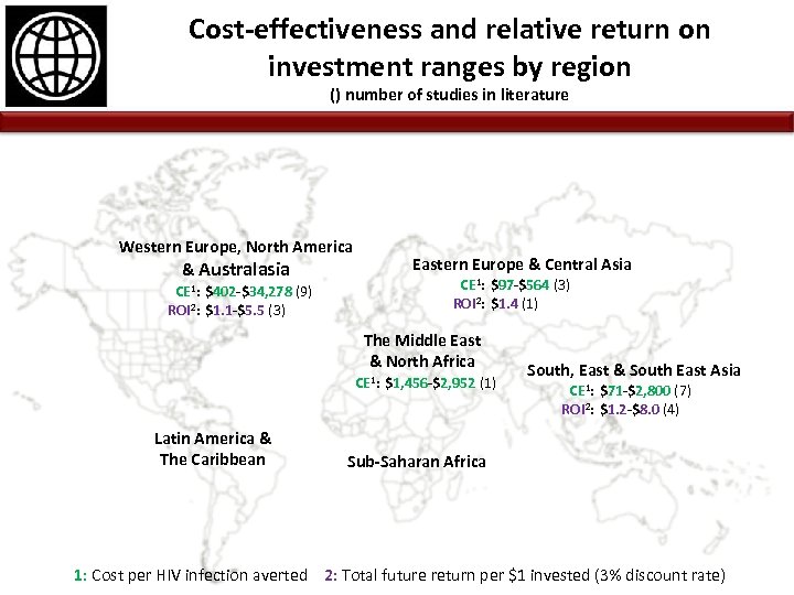 Cost-effectiveness and relative return on investment ranges by region () number of studies in literature Western Europe, North America & Australasia CE 1: $402 -$34, 278 (9) ROI 2: $1. 1 -$5. 5 (3) Eastern Europe & Central Asia CE 1: $97 -$564 (3) ROI 2: $1. 4 (1) The Middle East & North Africa CE 1: $1, 456 -$2, 952 (1) Latin America & The Caribbean South, East & South East Asia CE 1: $71 -$2, 800 (7) ROI 2: $1. 2 -$8. 0 (4) Sub-Saharan Africa 1: Cost per HIV infection averted 2: Total future return per $1 invested (3% discount rate)