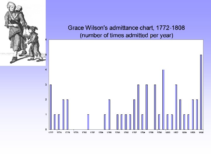 Case study 1: persistent applicants It is possible to create a number of case histories. Unlike many studies of this sort, it is possible to state exactly how typical these are. Grace Wilson (fl. 1772 -1809) is utterly atypical • Grace Wilson was admitted to the St Martin’s Workhouse 67 times between 1772 and until her death in the institution in 1808. The most frequently admitted pauper in the Georgian workhouse. • First admitted in 1772, she appears regularly thereafter until her death in 1809 • Stated to be 36 in 1772, she was 67 in 1808. Her ageing process clearly ‘slowed down’, since should have been 72 in 1808 - if earlier age statements were correct.