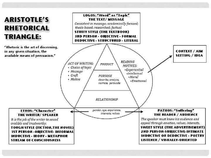 HOW TO CONSTRUCT A WINNING CASE • So, the ancient Greeks, who developed our basic concepts of logic (sensible thought), isolated three factors that make a good argument: logos, pathos, and ethos.
