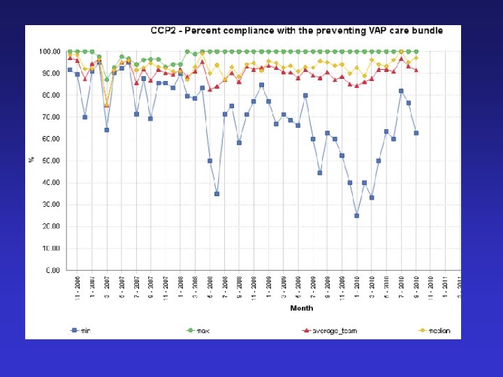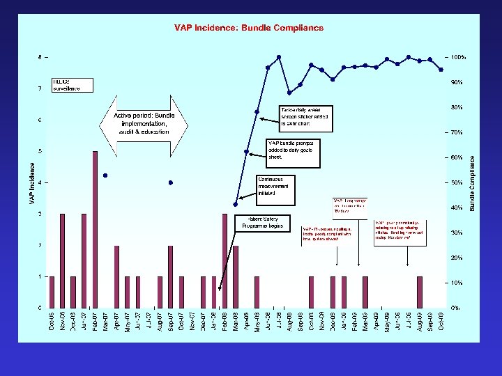 Active Implementation • Education: workshops: definition, epidemiology, pathogenesis, risk factors, consequences of VAP, evidence-base for the bundle. • Written material distributed. • Over 90% of the unit’s medical and nursing staff by April 2007. • Repeat cycles of process and outcome measurement and feedback.