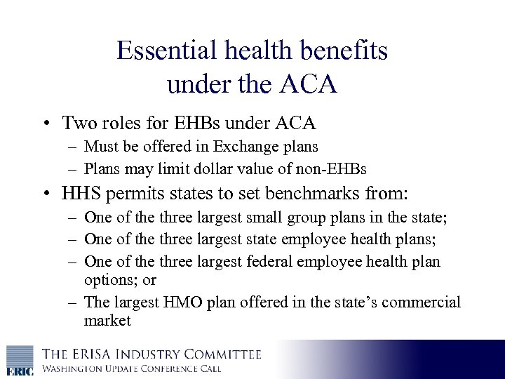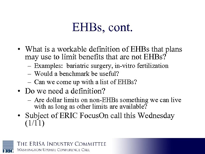 EHBs, cont. • What is a workable definition of EHBs that plans may use to limit benefits that are not EHBs? – Examples: bariatric surgery, in-vitro fertilization – Would a benchmark be useful? – Can we come up with a list of EHBs? • Do we need a definition? – Are dollar limits on non-EHBs something we can live with as long as other limits are available? • Subject of ERIC Focus. On call this Wednesday (1/11)