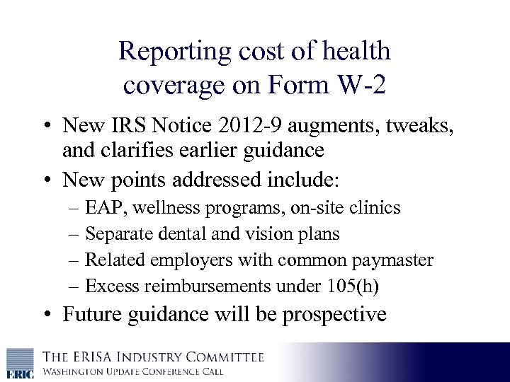 Reporting cost of health coverage on Form W-2 • New IRS Notice 2012 -9 augments, tweaks, and clarifies earlier guidance • New points addressed include: – EAP, wellness programs, on-site clinics – Separate dental and vision plans – Related employers with common paymaster – Excess reimbursements under 105(h) • Future guidance will be prospective