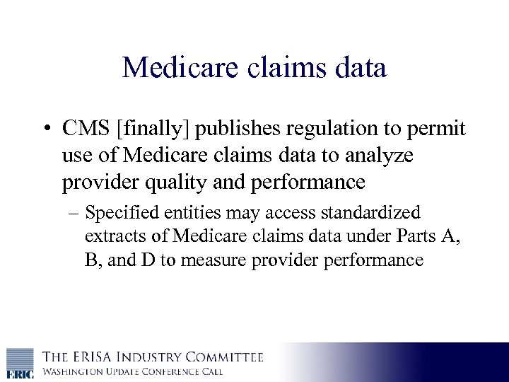 Medicare claims data • CMS [finally] publishes regulation to permit use of Medicare claims data to analyze provider quality and performance – Specified entities may access standardized extracts of Medicare claims data under Parts A, B, and D to measure provider performance