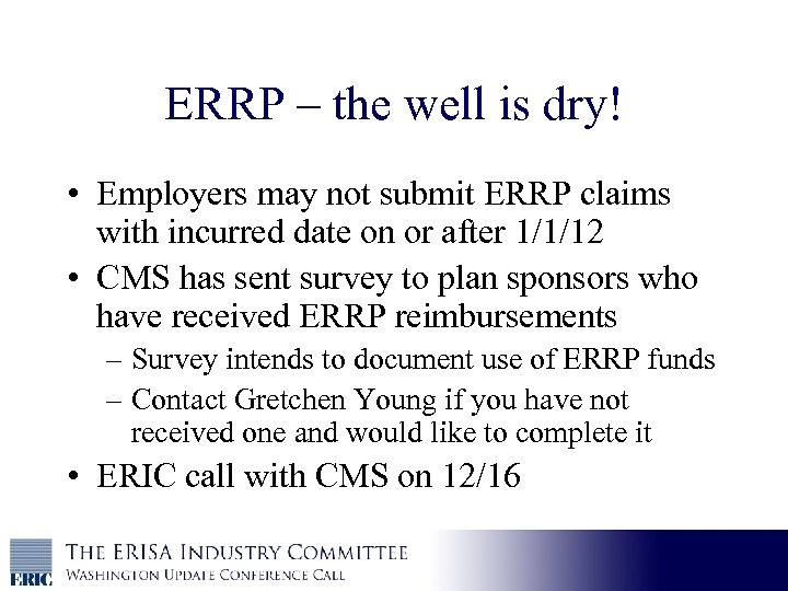 ERRP – the well is dry! • Employers may not submit ERRP claims with incurred date on or after 1/1/12 • CMS has sent survey to plan sponsors who have received ERRP reimbursements – Survey intends to document use of ERRP funds – Contact Gretchen Young if you have not received one and would like to complete it • ERIC call with CMS on 12/16