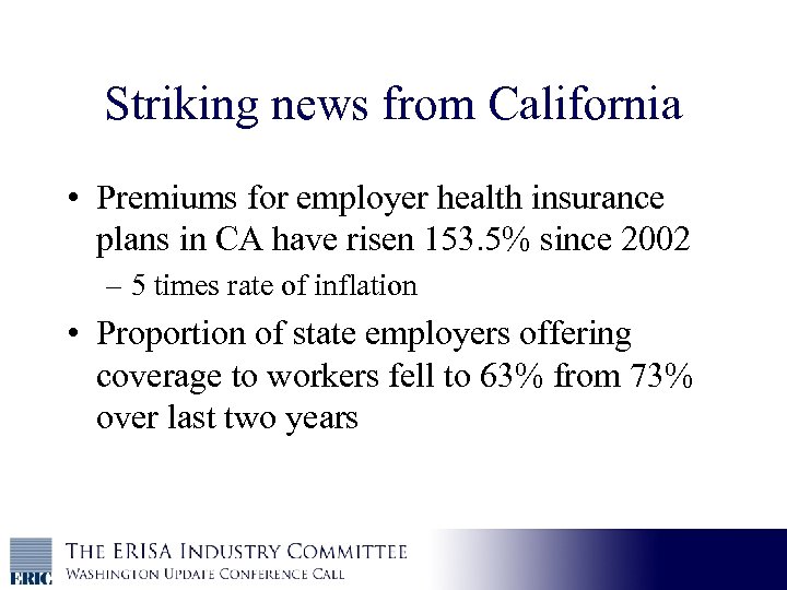 Striking news from California • Premiums for employer health insurance plans in CA have risen 153. 5% since 2002 – 5 times rate of inflation • Proportion of state employers offering coverage to workers fell to 63% from 73% over last two years