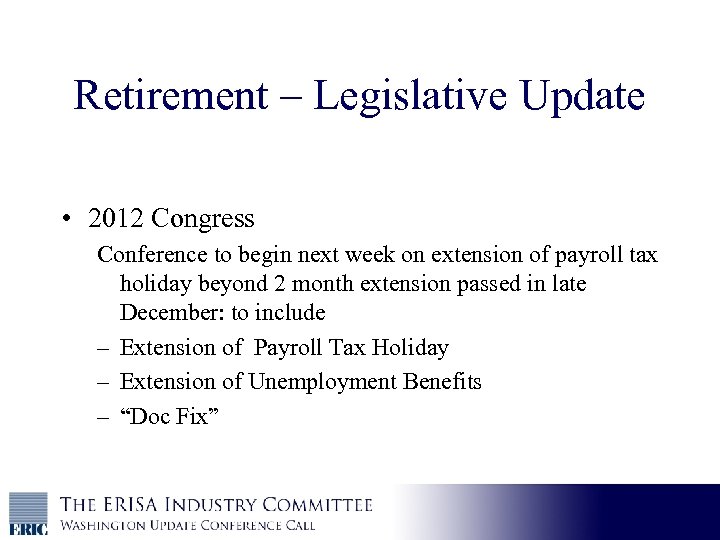 Retirement – Legislative Update • 2012 Congress Conference to begin next week on extension of payroll tax holiday beyond 2 month extension passed in late December: to include – Extension of Payroll Tax Holiday – Extension of Unemployment Benefits – “Doc Fix”