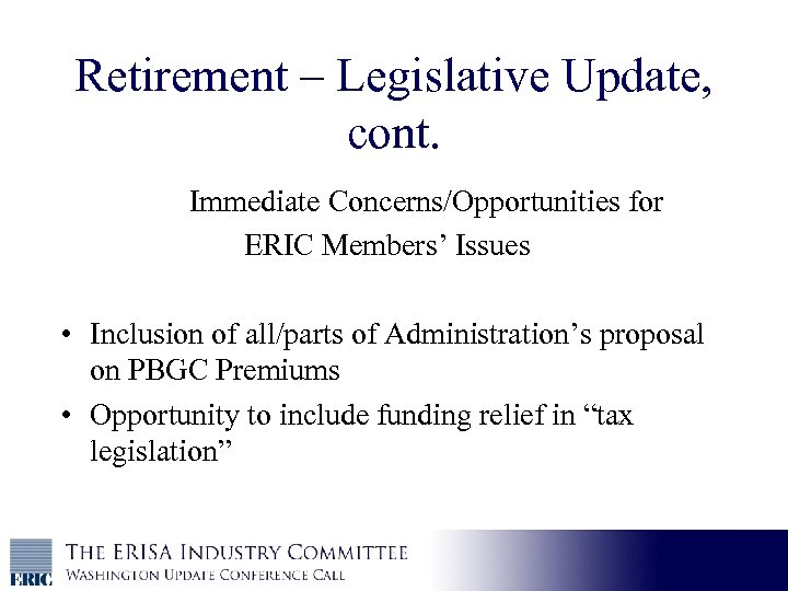 Retirement – Legislative Update, cont. Immediate Concerns/Opportunities for ERIC Members’ Issues • Inclusion of all/parts of Administration’s proposal on PBGC Premiums • Opportunity to include funding relief in “tax legislation”