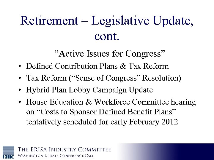 Retirement – Legislative Update, cont. “Active Issues for Congress” • • Defined Contribution Plans & Tax Reform (“Sense of Congress” Resolution) Hybrid Plan Lobby Campaign Update House Education & Workforce Committee hearing on “Costs to Sponsor Defined Benefit Plans” tentatively scheduled for early February 2012