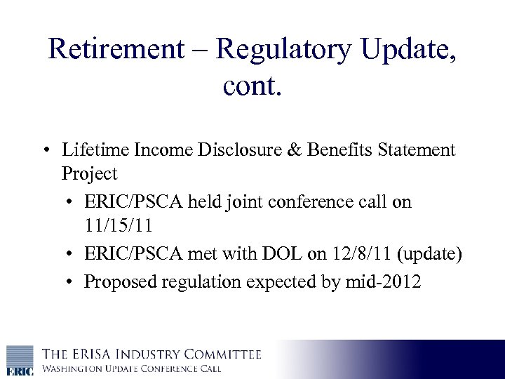 Retirement – Regulatory Update, cont. • Lifetime Income Disclosure & Benefits Statement Project • ERIC/PSCA held joint conference call on 11/15/11 • ERIC/PSCA met with DOL on 12/8/11 (update) • Proposed regulation expected by mid-2012