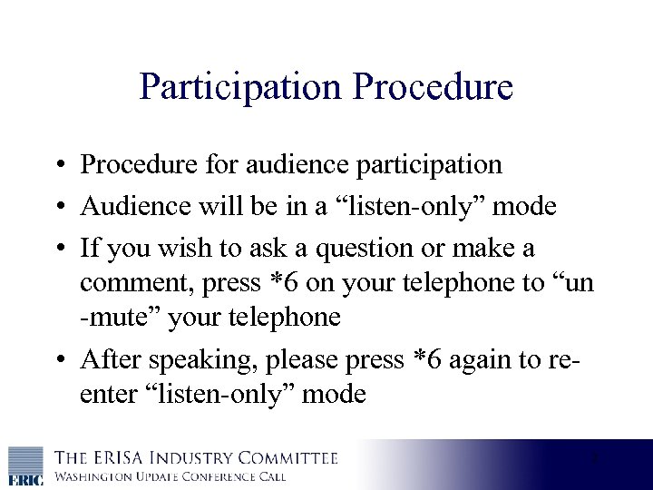 Participation Procedure • Procedure for audience participation • Audience will be in a “listen-only” mode • If you wish to ask a question or make a comment, press *6 on your telephone to “un -mute” your telephone • After speaking, please press *6 again to reenter “listen-only” mode 2