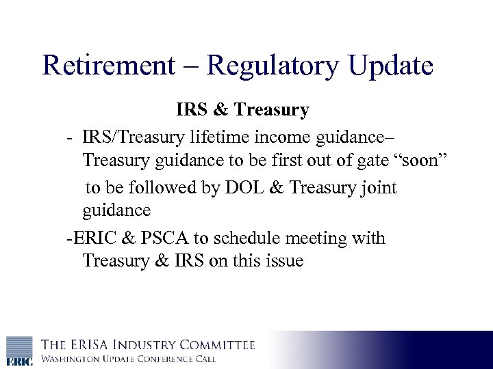 Retirement – Regulatory Update IRS & Treasury - IRS/Treasury lifetime income guidance– Treasury guidance to be first out of gate “soon” to be followed by DOL & Treasury joint guidance -ERIC & PSCA to schedule meeting with Treasury & IRS on this issue
