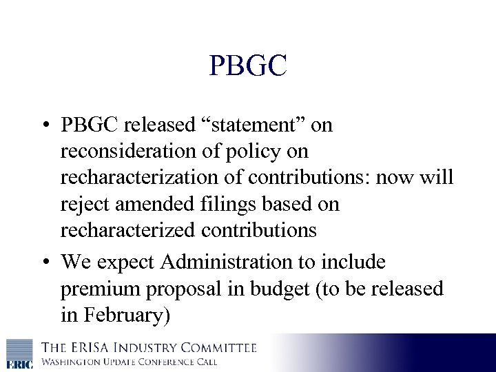 PBGC • PBGC released “statement” on reconsideration of policy on recharacterization of contributions: now will reject amended filings based on recharacterized contributions • We expect Administration to include premium proposal in budget (to be released in February)