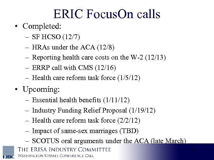 ERIC Focus. On calls • Completed: – – – SF HCSO (12/7) HRAs under the ACA (12/8) Reporting health care costs on the W-2 (12/13) ERRP call with CMS (12/16) Health care reform task force (1/5/12) • Upcoming: – – – Essential health benefits (1/11/12) Industry Funding Relief Proposal (1/19/12) Health care reform task force (2/2/12) Impact of same-sex marriages (TBD) SCOTUS oral arguments under the ACA (late March) 22