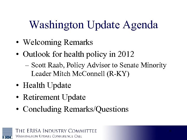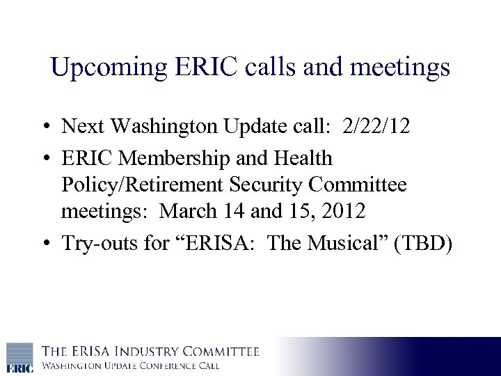 Upcoming ERIC calls and meetings • Next Washington Update call: 2/22/12 • ERIC Membership and Health Policy/Retirement Security Committee meetings: March 14 and 15, 2012 • Try-outs for “ERISA: The Musical” (TBD)
