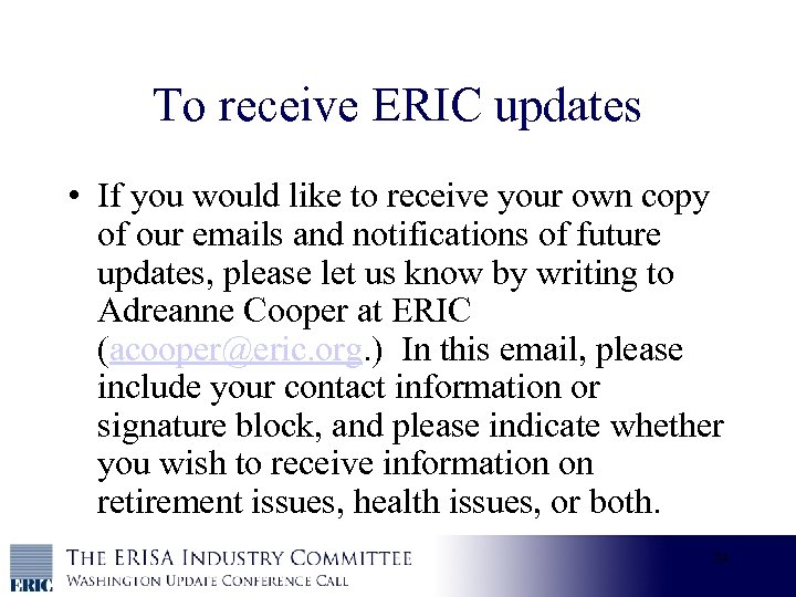 To receive ERIC updates • If you would like to receive your own copy of our emails and notifications of future updates, please let us know by writing to Adreanne Cooper at ERIC (acooper@eric. org. ) In this email, please include your contact information or signature block, and please indicate whether you wish to receive information on retirement issues, health issues, or both. 24
