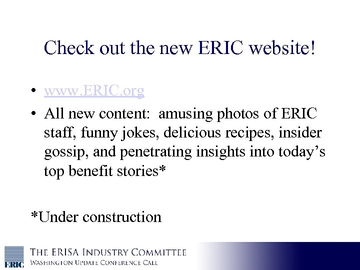 Check out the new ERIC website! • www. ERIC. org • All new content: amusing photos of ERIC staff, funny jokes, delicious recipes, insider gossip, and penetrating insights into today’s top benefit stories* *Under construction