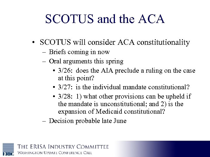 SCOTUS and the ACA • SCOTUS will consider ACA constitutionality – Briefs coming in now – Oral arguments this spring • 3/26: does the AIA preclude a ruling on the case at this point? • 3/27: is the individual mandate constitutional? • 3/28: 1) what other provisions can be upheld if the mandate is unconstitutional; and 2) is the expansion of Medicaid constitutional? – Decision probable late June