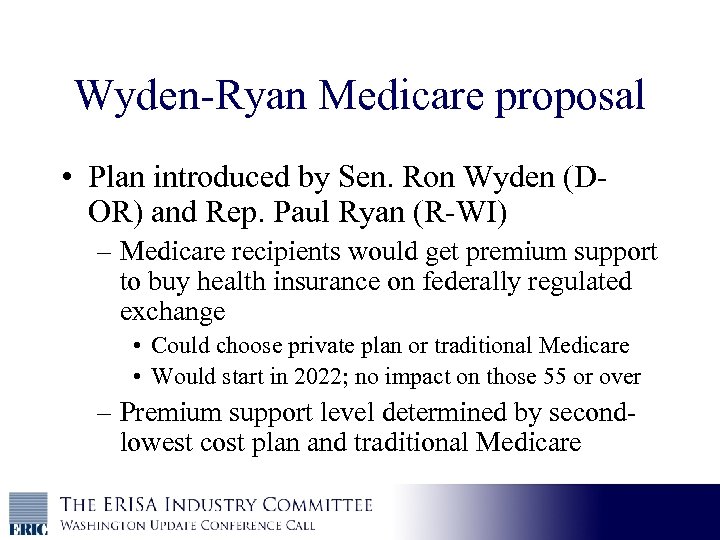 Wyden-Ryan Medicare proposal • Plan introduced by Sen. Ron Wyden (DOR) and Rep. Paul Ryan (R-WI) – Medicare recipients would get premium support to buy health insurance on federally regulated exchange • Could choose private plan or traditional Medicare • Would start in 2022; no impact on those 55 or over – Premium support level determined by secondlowest cost plan and traditional Medicare