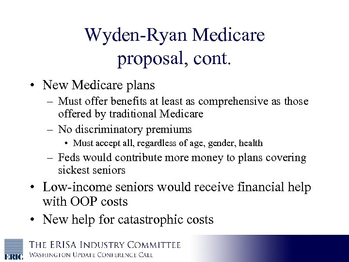 Wyden-Ryan Medicare proposal, cont. • New Medicare plans – Must offer benefits at least as comprehensive as those offered by traditional Medicare – No discriminatory premiums • Must accept all, regardless of age, gender, health – Feds would contribute more money to plans covering sickest seniors • Low-income seniors would receive financial help with OOP costs • New help for catastrophic costs