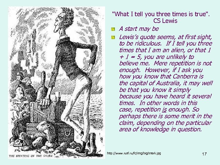 "What I tell you three times is true". CS Lewis A start may be Lewis’s quote seems, at first sight, to be ridiculous. If I tell you three times that I am an alien, or that 1 + 1 = 5, you are unlikely to believe me. Mere repetition is not enough. However, if I ask you how you know that Canberra is the capital of Australia, it may well be that you know it simply because you have heard it several times. In other words in this case, repetition is enough. So perhaps there is some merit in the claim, depending on the particular area of knowledge in question. http: //www. rusf. ru/fc/img/big/snark. jpg 17