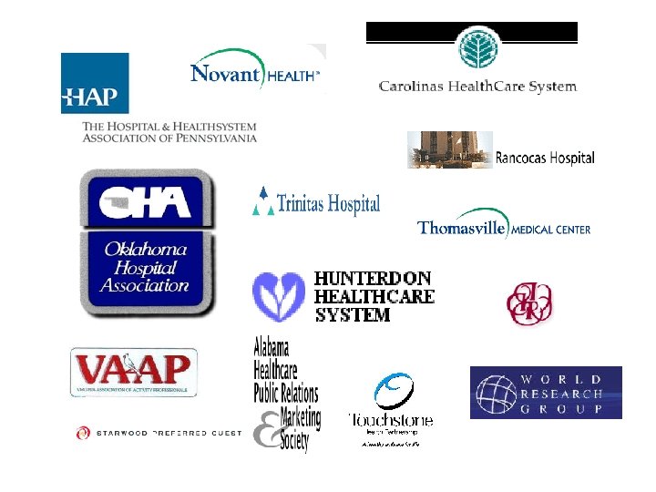The Preliminaries • Trend spotting • Core services; service diversification • Market share • Facilities • Strategic Plan • Service Area • Key Audiences • Employees • Referring Physicians • Discharge Planners • Politicians • Clergy • Business • Volunteers • Service Organizations • Fundraising • Emergency Medical Services • Media • Support Groups • Affinity Groups • Unions • Payers • Financial Institution • Government • Vendors • Residents • Community • Families and Caregivers