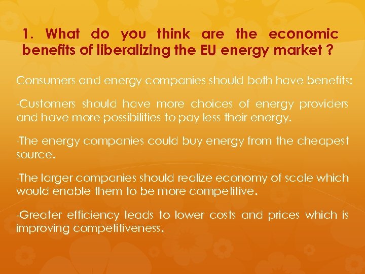 1. What do you think are the economic benefits of liberalizing the EU energy market ? Consumers and energy companies should both have benefits: -Customers should have more choices of energy providers and have more possibilities to pay less their energy. -The energy companies could buy energy from the cheapest source. -The larger companies should realize economy of scale which would enable them to be more competitive. -Greater efficiency leads to lower costs and prices which is improving competitiveness.