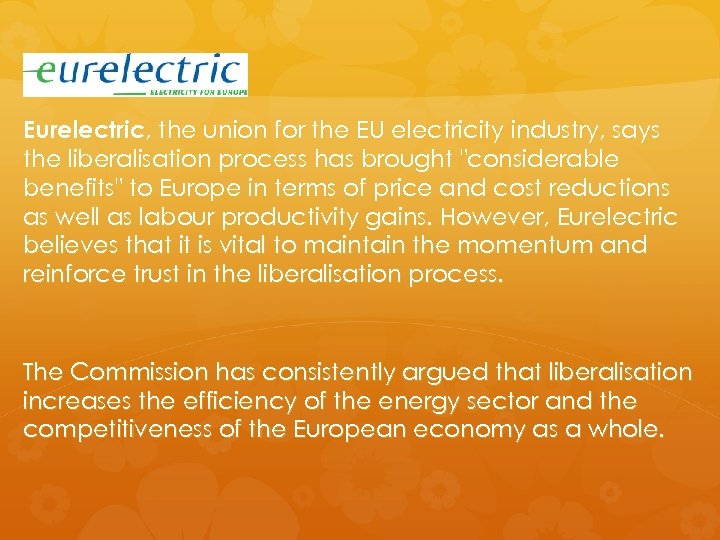 Eurelectric, the union for the EU electricity industry, says the liberalisation process has brought "considerable benefits" to Europe in terms of price and cost reductions as well as labour productivity gains. However, Eurelectric believes that it is vital to maintain the momentum and reinforce trust in the liberalisation process. The Commission has consistently argued that liberalisation increases the efficiency of the energy sector and the competitiveness of the European economy as a whole.